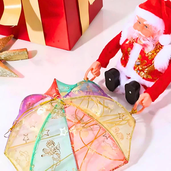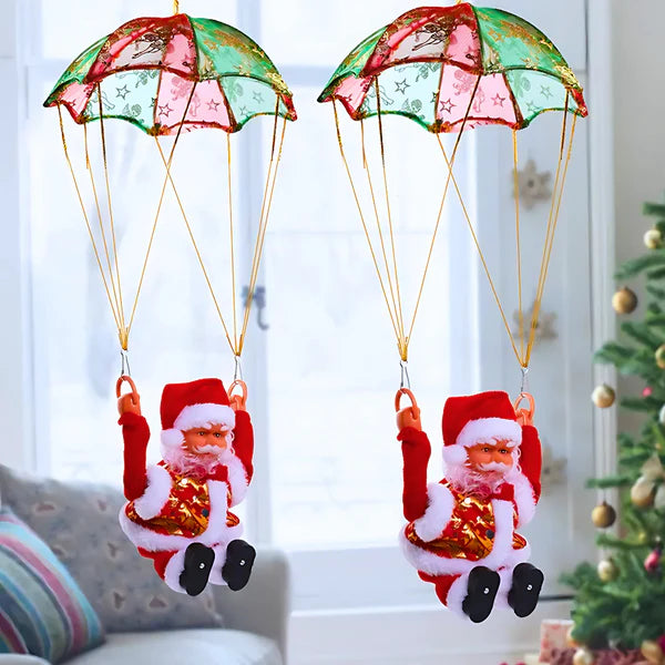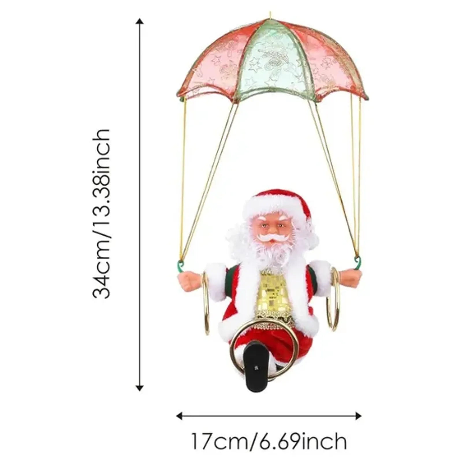 Ovaj Deda Mraz na padobranu ne stoji statično — on se kreće i izvodi salta, dok muzika dodatno stvara veselu atmosferu.