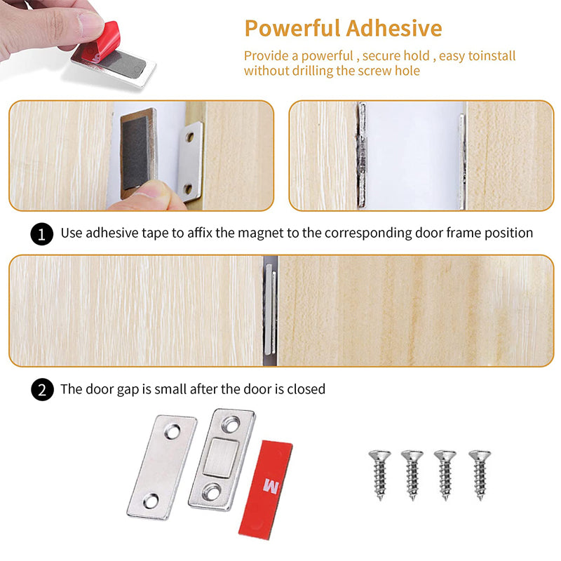 Ovaj set magneta je idealan za zatvaranje vrata ormara, kuhinjskih elemenata, ili drugih vrata u kući. Ultra-tanko dizajniran, ovaj set omogućava diskretno zatvaranje vrata bez vidljivih zatvarača.