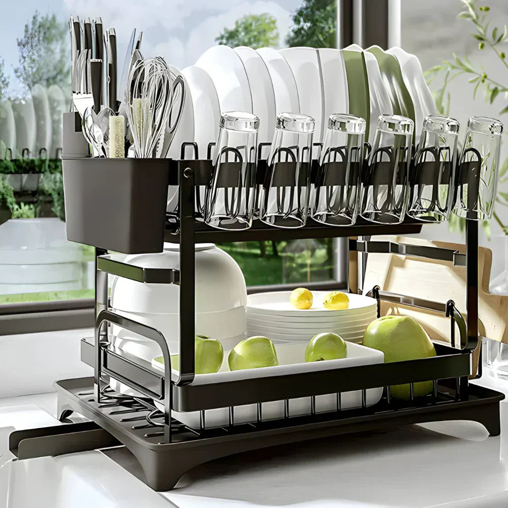 Rešetkasti dizajn omogućava brzo sušenje bez stvaranja vlage i neprijatnih mirisa. Dodatni deo za escajg osigurava da i pribor bude uredno odložen i osušen. Nema više improvizovanih konstrukcija od sudova – sve ima svoje mesto!